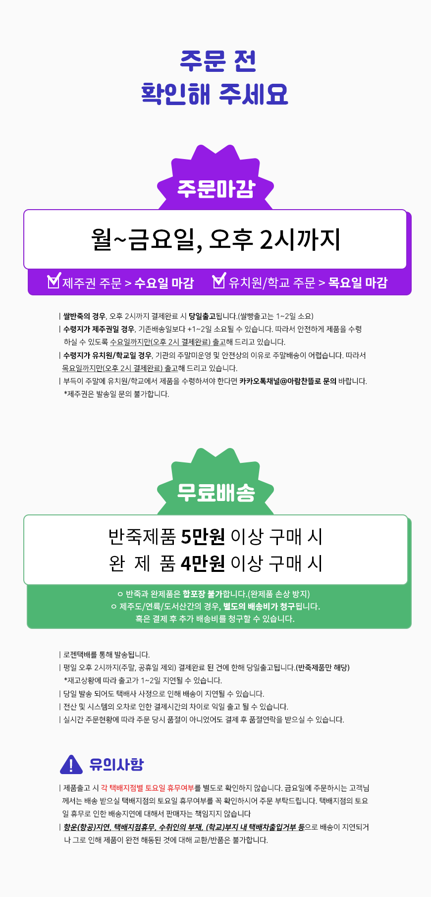 배송일 오후2시 까지 입금한 주문에 대해 당일 발송처리되며(반죽제품만), 이후에 결제하신 주문은 익일 배송됩니다.