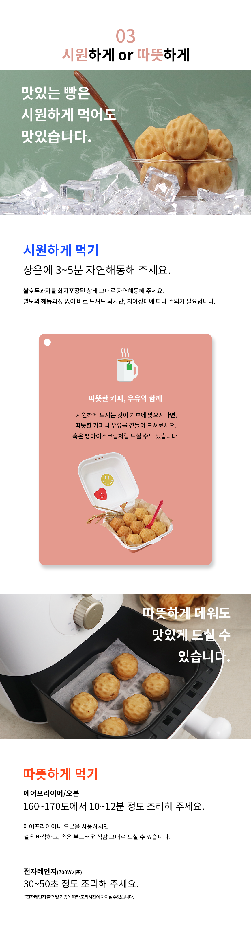냉동제품의 경우, 반죽은 장기 냉동 보관시 침전현상이나 변색 현상이 일어날 수 있으나 제품에는 이상이 없으니 안심하고 드셔도 됩니다.